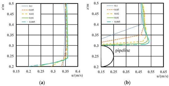 To determine the grid size, trial calculations were conducted using square grids with side lengths of 0.1 m, 0.05 m, 0.02 m, 0.01 m, and 0.005 m. Once the flow field stabilized, the horizontal velocity distributions at the cross-sections of x = −1 m and x = 0 were compared, as shown in Figure 3.