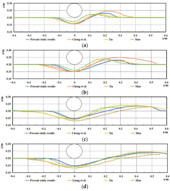 The scouring pit topography profiles around the pipeline at various time intervals for Condition 1 were exported and compared with the laboratory scour experiments conducted by Mao [], the numerical simulations by Cheng et al. [], and the numerical simulations by Xu [], as shown in Figure 4.
