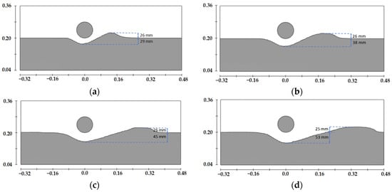 Geometric dimensions of the sand wave seabed model (water depth 0.35 m): (a) Sand wave crest condition, (b) sand wave trough condition, (c) sand wave midline upstream side condition, (d) sand wave midline downstream side condition.