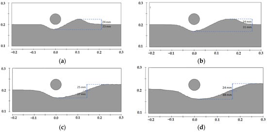 Comparison of scour profile shapes around the pipeline at different moments [,,], (a) t = 10 min, (b) t = 30 min, (c) t = 200 min, (d) t = 370 min.