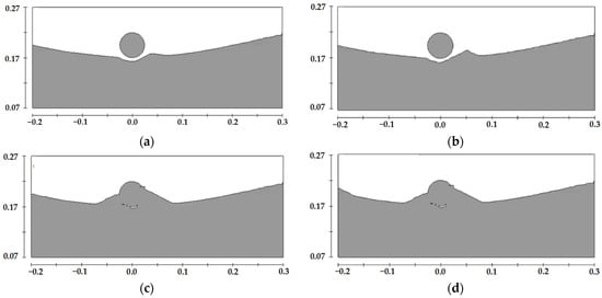 Schematic diagram of scour profiles at different moments for a pipeline with a diameter of 0.05 m located on the downstream side of the sand wave midline under a water depth of 0.35 m, (a) t = 4 min, (b) t = 12 min, (c) t = 40 min, (d) t = 120 min.