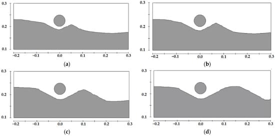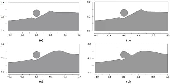 Schematic diagram of scour profiles at different moments for a pipeline with a diameter of 0.05 m located at the trough of sand waves under a water depth of 0.35 m, (a) t = 4 min, (b) t = 12 min, (c) t = 40 min, (d) t = 120 min.