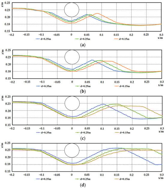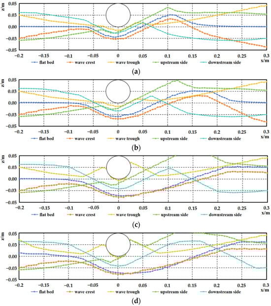 Comparison of scour profiles under varying water depths for the crest condition of the sand wave seabed, at various moments, D = 0.05 m, (a) t = 4 min, (b) t = 12 min, (c) t = 40 min, (d) t = 120 min.