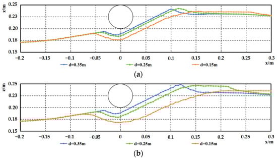 When the pipeline is on the upstream or downstream side, the influence of water depth on scour morphology becomes most pronounced. Notably, as the water depth decreases, the sediment scour characteristics around the pipeline located on the upstream side along the sand wave centerline undergo significant changes, with the dominant process shifting from deposition to scour, leading to distinct alterations in the profile shape. When the pipeline is on the downstream side, the scour morphology at equilibrium also exhibits significant differences. The dune height behind the pipeline remains constant, but shallower water conditions accelerate dune development, push the dune’s trailing edge further downstream, and result in a greater maximum scour depth.