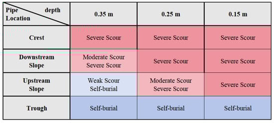 Based on the varying relative positions between the pipeline and sand waves, as well as different water depths, a design-oriented distribution map of scour intensity and pipeline self-burial can be developed, as shown in Figure 20.