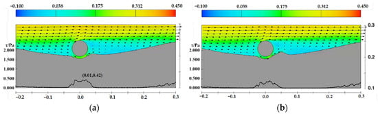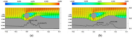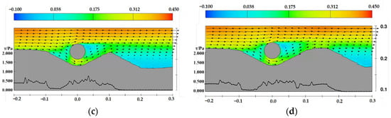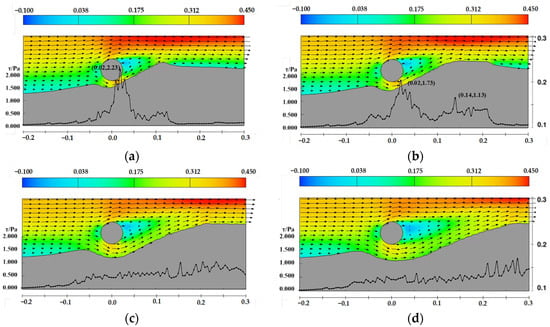 In addition, the velocity distribution and shear stress distribution on the upstream side along the sand wave centerline for pipelines at water depths of 0.25 m and 0.15 m are shown in Figure 26 and Figure 27. Unlike the case with a water depth of 0.35 m, the decrease in water depth leads to an increase in (D/d), resulting in higher cross-sectional flow velocity and increased shear stress. Under these two conditions, the scour pit beneath the pipeline continues to develop.