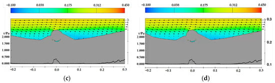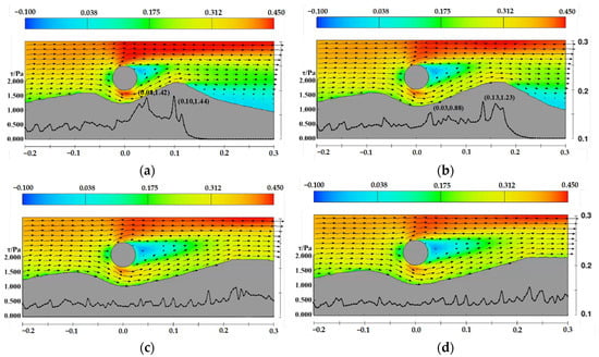 Velocity and shear stress distribution near the pipeline under the sand wave midline upstream side case, D = 0.05 m, d = 0.25 m, the arrows represent velocity vectors (a) t = 4 min, (b) t = 12 min, (c) t = 40 min, (d) t = 120 min.