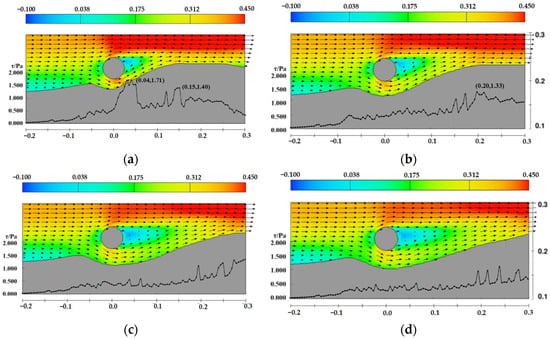 Velocity and shear stress distribution near the pipeline under the sand wave midline upstream side case, D = 0.05 m, d = 0.15 m, the arrows represent velocity vectors (a) t = 4 min, (b) t = 12 min, (c) t = 40 min, (d) t = 120 min.