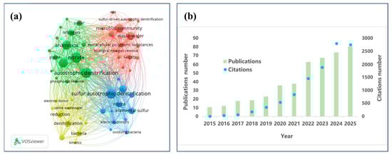 In this context, autotrophic denitrification has received increasing attention as a low-carbon alternative, which can significantly reduce the risk of organic pollution and excess sludge generation. Hence, this approach is regarded as an effective, appropriate, and eco-friendly biological method for nitrogen removal []. Autotrophic denitrification relies on inorganic substances such as hydrogen (H2), reduced sulfur compounds, and ferrous ions as electron donors []. Among them, sulfur-based autotrophic denitrification (SAD) demonstrates notable benefits in achieving advanced nitrogen removal from municipal wastewater. This process obtains energy through the oxidation of reduced sulfides and uses nitrate as the terminal electron acceptor []. SAD not only has low operating costs and no direct carbon dioxide emissions, but also has extremely low biomass and sludge yield due to its autotrophic characteristics []. Given these advantages, the SAD process has gained wide attention as a promising option for lowering nitrate concentrations in both water and wastewater treatment (Figure 1). The pilot-scale fixed-bed and packed-bed systems have achieved efficient denitrification in a short hydraulic retention time in the treatment of secondary effluent []. The key functional microorganisms in SAD are mainly Thiobacillus and Thiomonas, which carry complete denitrification gene clusters []. A successful biological nitrogen removal process usually depends on a stable and balanced microbial community, and various functional floras ensure system stability and treatment performance through synergy [].