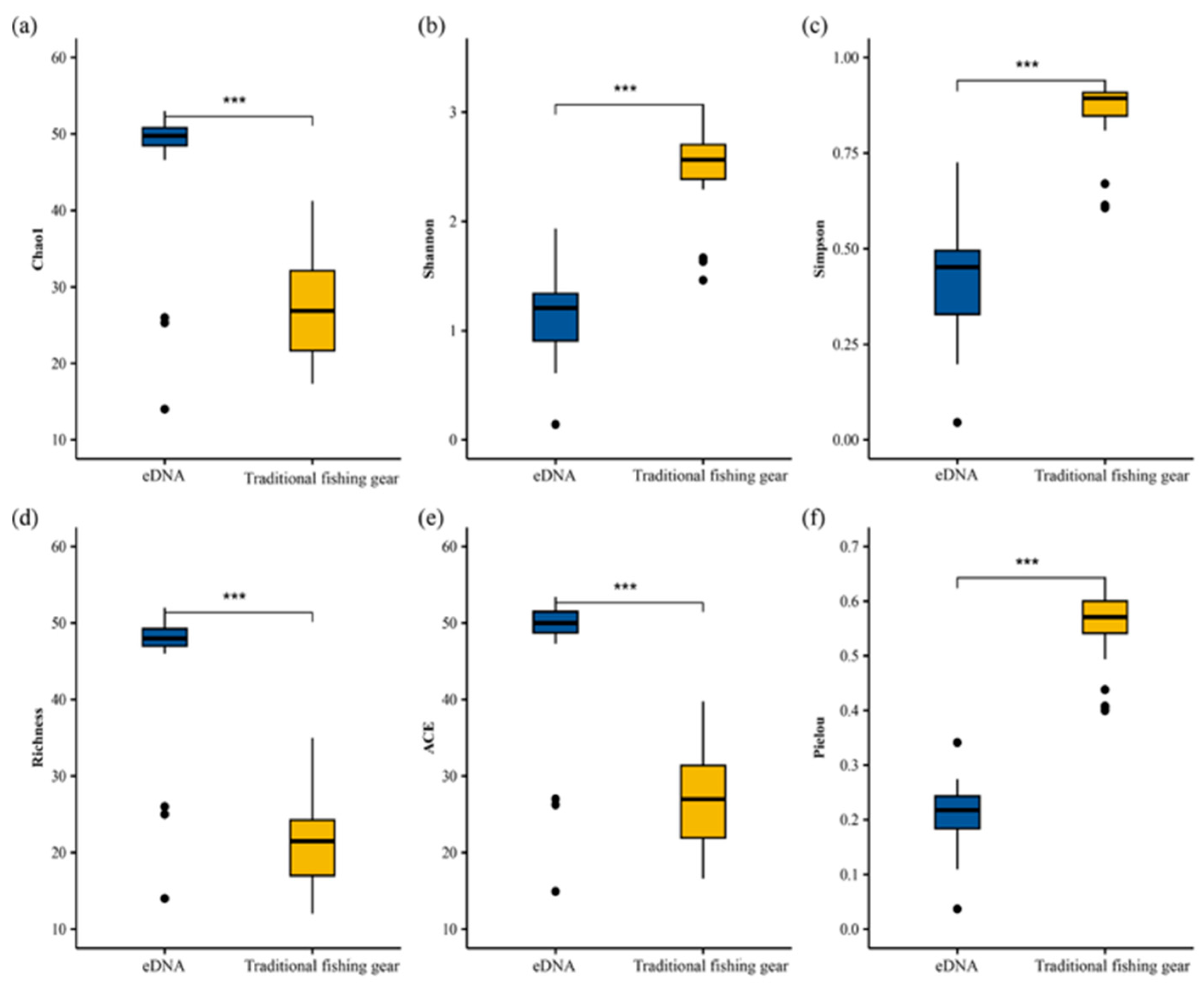 3.2.1. Alpha Diversity Analysis Based on eDNA and Traditional Fishing Gear