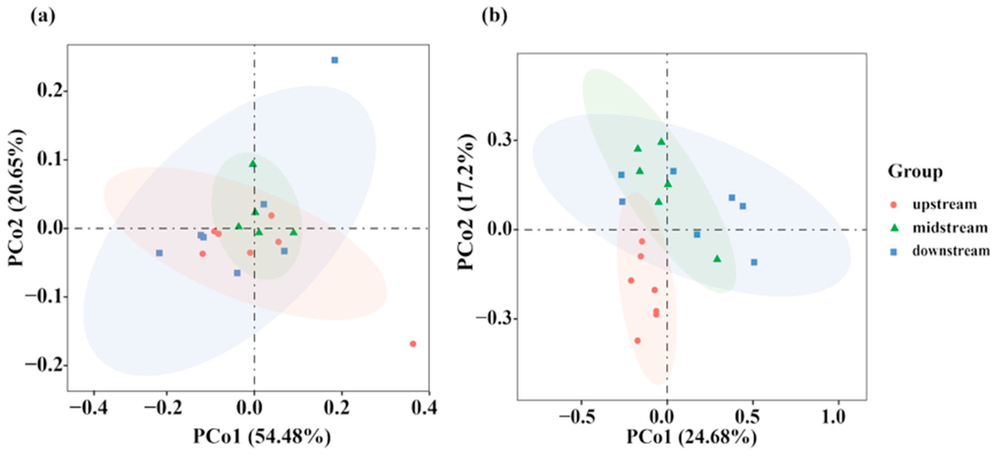 - Ji, F.F.; Shen, J.Z.; Zhang, W.Q.; Yan, S.H.; Shan, B.Q.; Zha, J.M. Discriminating spatiotemporal heterogeneity and environmental drivers of fish assemblages using environmental DNA metabarcoding in mosaic habitat ecosystems. Sci. Rep. 2025, 15, 15705. [Google Scholar] [CrossRef] [PubMed]