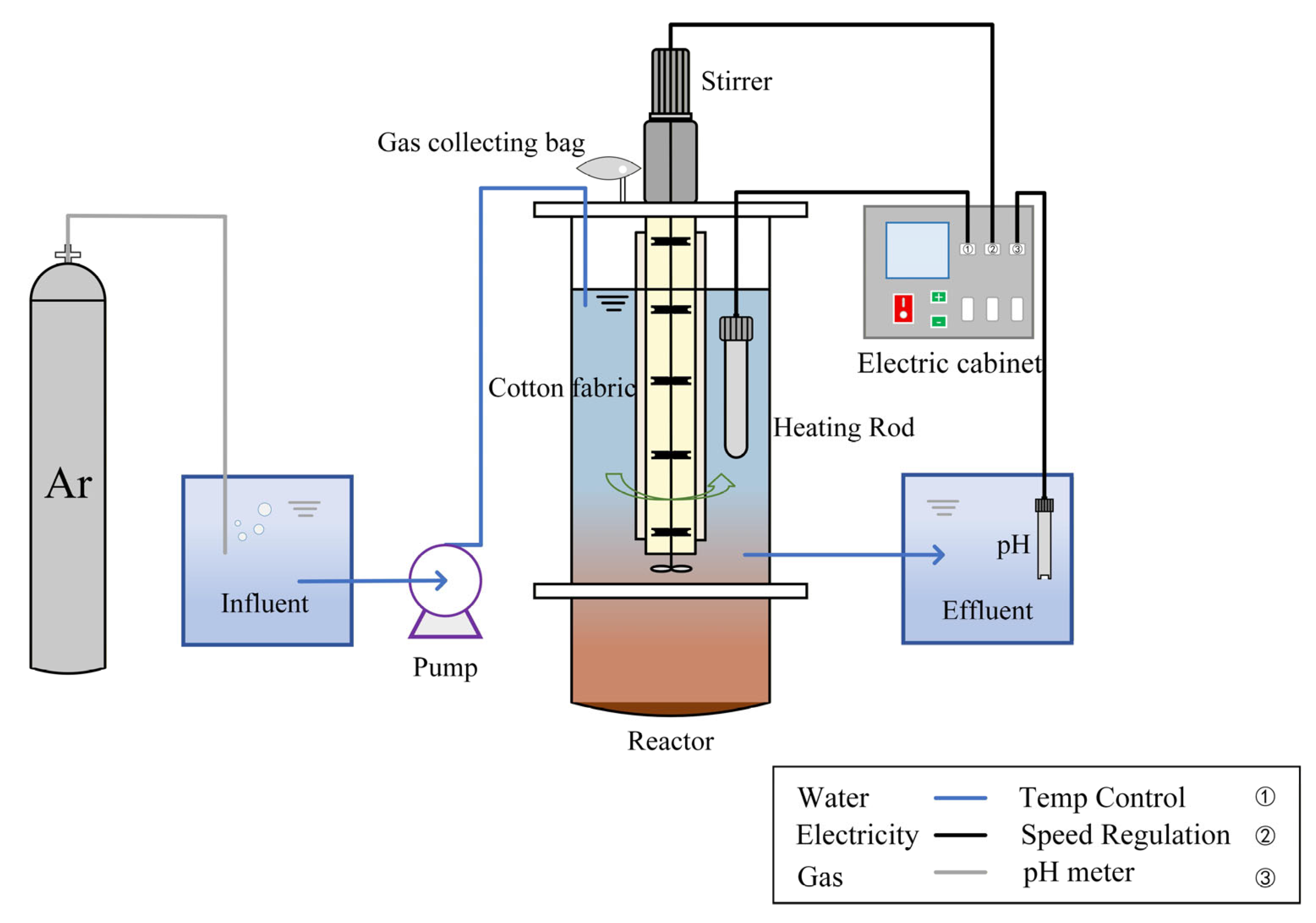 The USBR experimental device was made from plexiglass with a total volume of 5 L. Influent was supplied by a peristaltic pump (BT100-2J, Longerpump, Baoding, China). A thermostatic water bath was placed inside the insulation layer to keep the reactor temperature at 32 ± 1 °C. To prevent light from affecting microbial growth, the reactor was wrapped with black cloth (Figure 1). The reactor had internal circulation and was divided into a reaction zone and a circulation zone. Cotton cloth was installed in the reaction zone to stabilize environmental conditions for microbial growth and to increase the contact area between sludge and wastewater. An automatic spiral agitator was located in the circulation zone to mix sludge and wastewater evenly, ensuring thorough reactions. Gas produced during the process was released from the top of the reactor to aid solid–liquid–gas separation. To maintain an anaerobic environment, argon was introduced during the initial stage to displace oxygen.