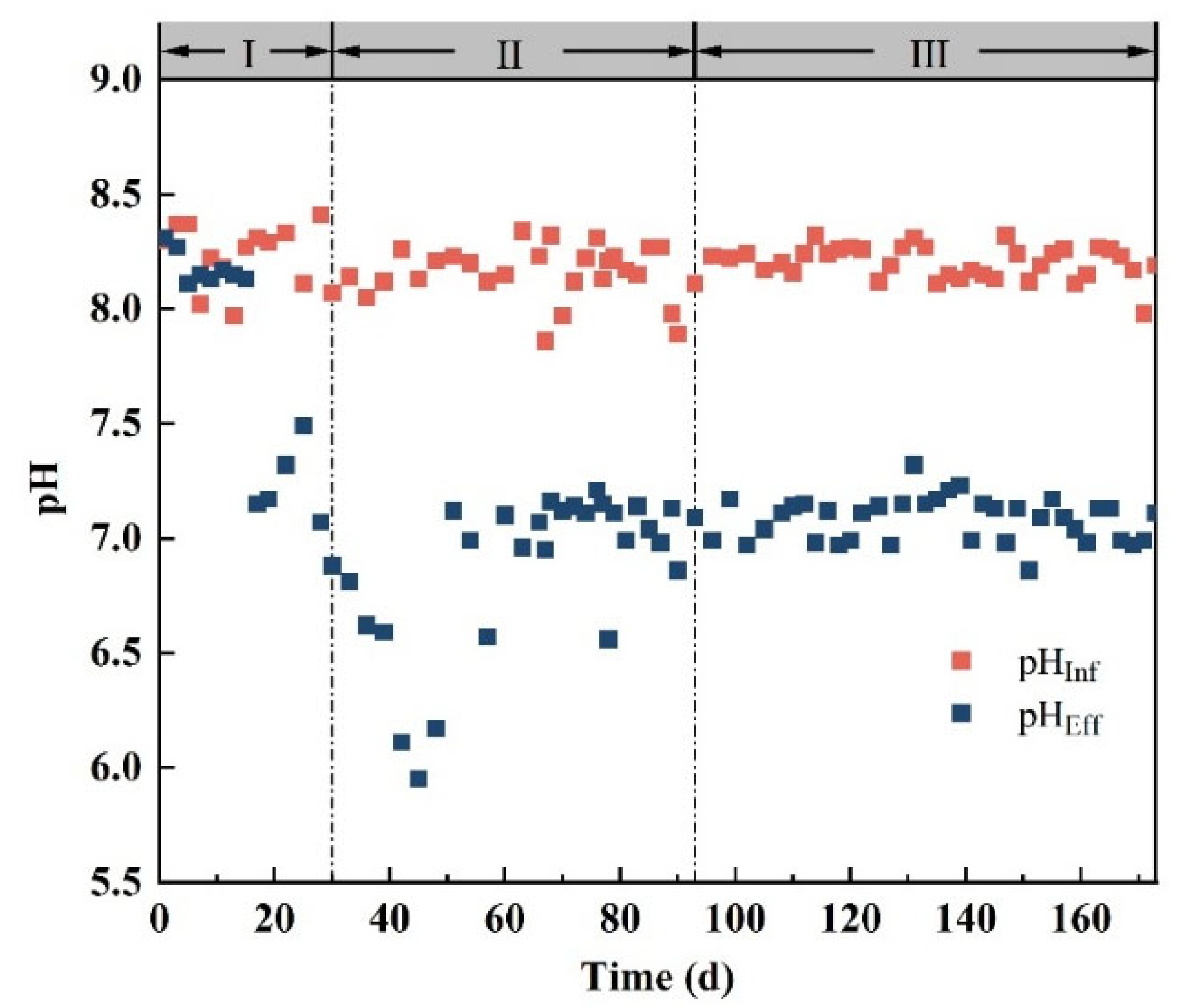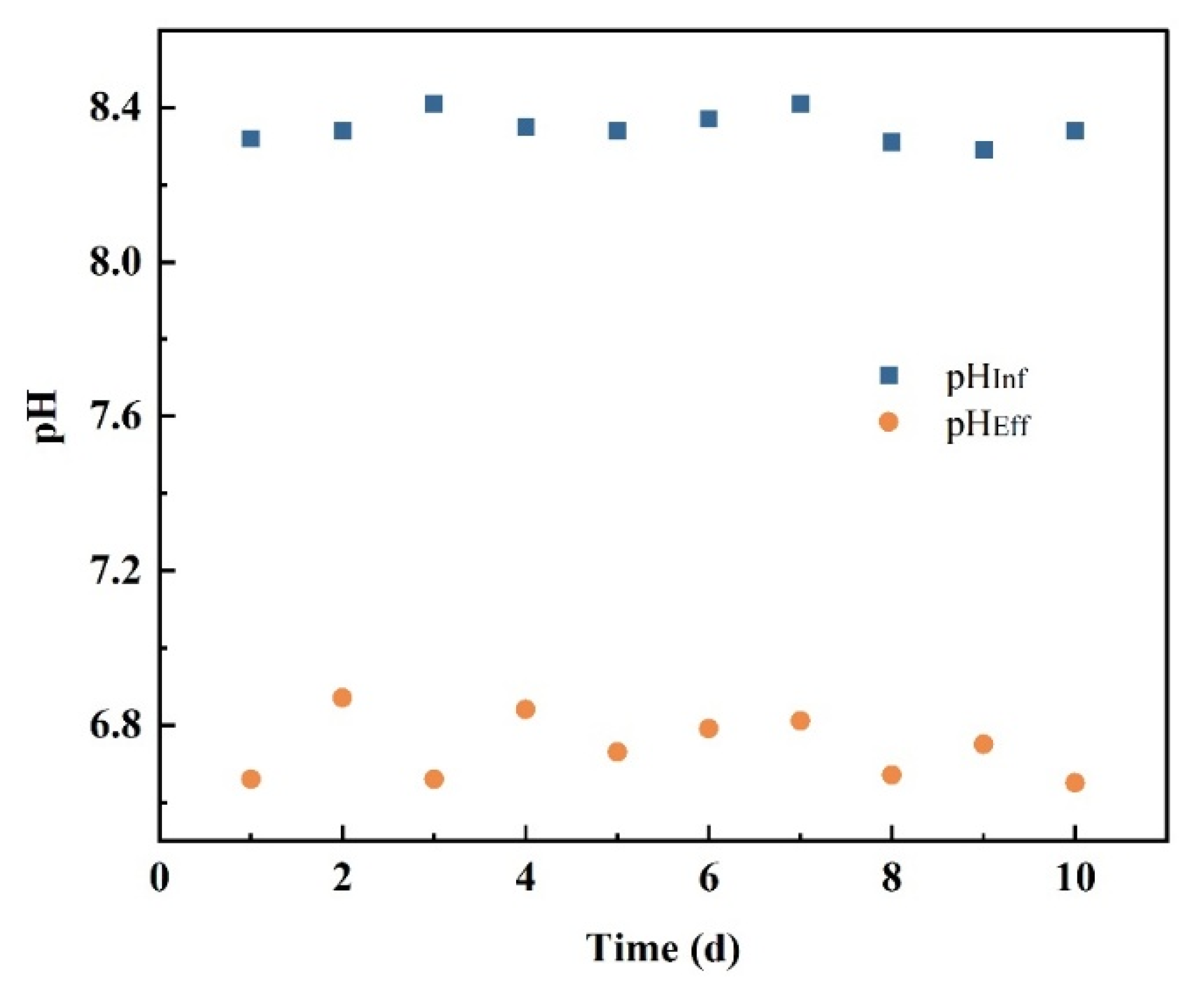 Influent and effluent pH were also monitored, with effluent values consistently lower than influent (Figure 11). Increasing influent HCO3 concentration slightly raised influent pH. Effluent pH changes were minimal in the first two stages but became slightly higher in Stage III. This was likely because HCO3 concentrations exceeded 1000 mg/L in Stage III, which hindered microbial growth and reduced the population capable of using HCO3 as an inorganic carbon source, thereby increasing effluent pH. Overall, effluent pH remained basically neutral.