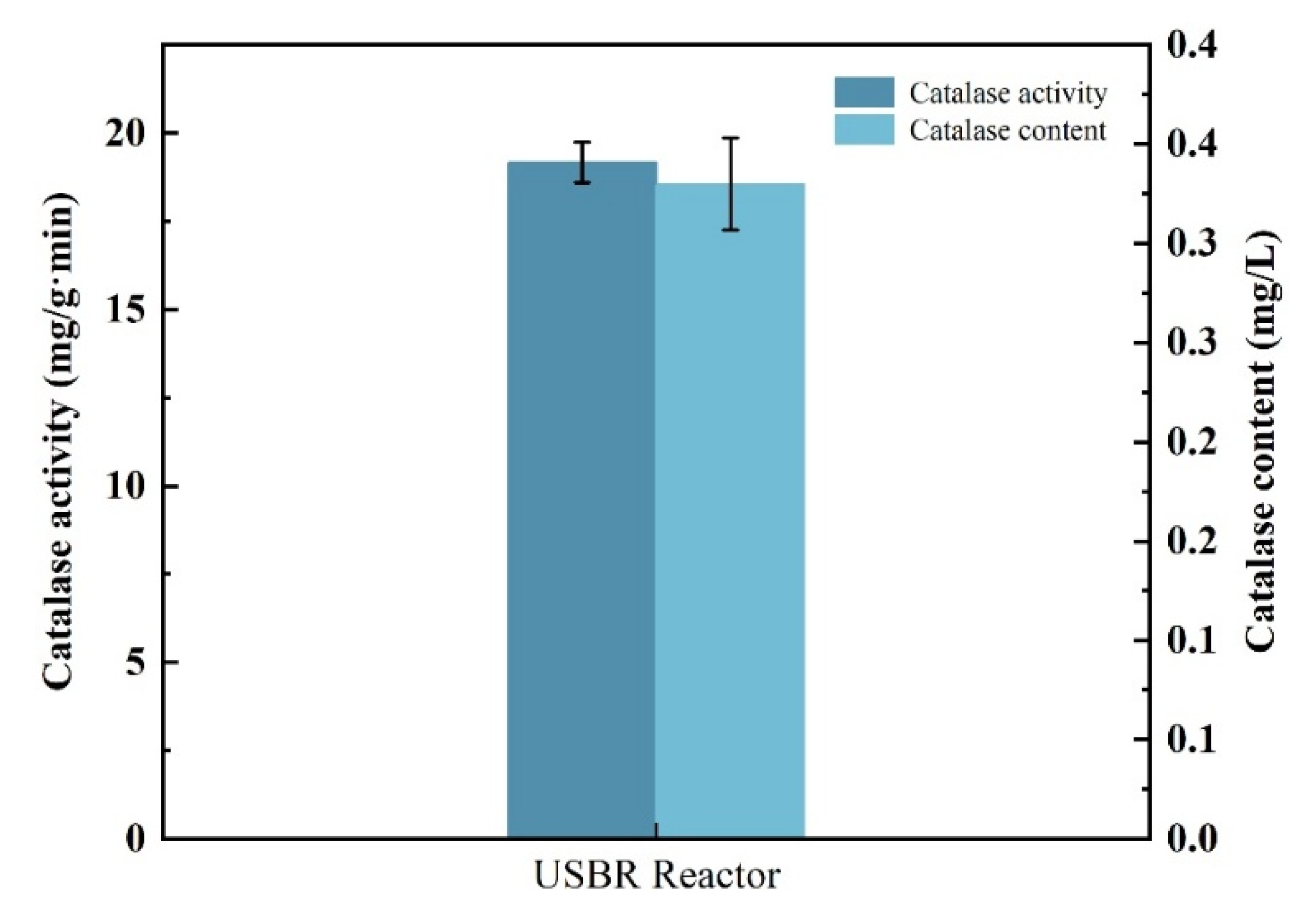 Catalase activity in the reactor was measured (Figure 6) at 18.15 H2O2 mg/g·min. The hydrogen peroxide concentration in the reactor was 0.37 mg/L. Previous studies [36] have shown that hydrogen peroxide can be produced by oxidases of facultative microorganisms under trace oxygen conditions. Additionally, superoxide radicals and hydrogen peroxide are known as unavoidable by-products of microbial metabolism [37,38]. These reactive oxygen species can be generated through the iron-catalyzed Fenton reaction and by various enzymes, including peroxidase and NADPH oxidase. Superoxide dismutase converts superoxide anions into hydrogen peroxide [39], which is then broken down into water and oxygen by catalase. Furthermore, other enzymes that protect anaerobic bacteria from reactive oxygen species have been documented [40,41]. Therefore, it can be inferred that microorganisms in the reactor reduced hydrogen peroxide toxicity by producing catalase to decompose H2O2, aligning with the findings of Anjali et al. [42].