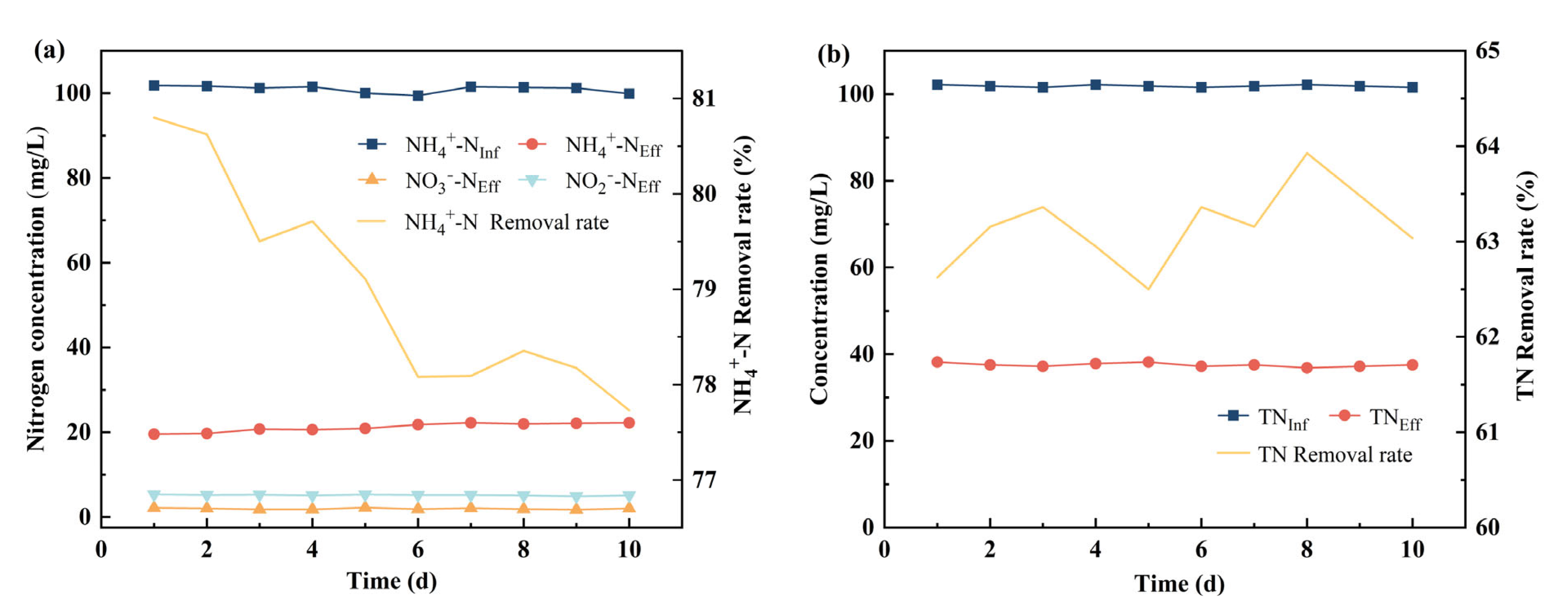 Although influent water was deoxygenated with high-purity argon for 40~50 min, routine operations such as water exchange and sampling inevitably kept the system in a microaerobic state. Dissolved oxygen at the bottom of the reactor was maintained at approximately 0.1 to 0.2 mg/L. These microaerobic conditions provided the necessary environment for NH4+-N conversion in the system.