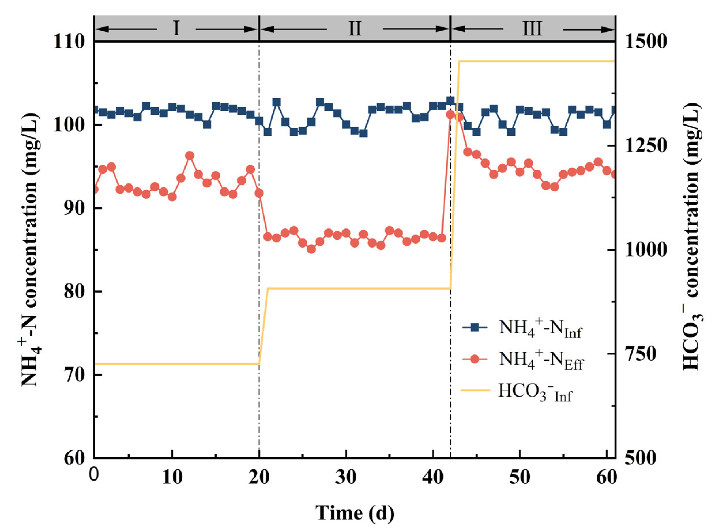 Although isotopic tracing or complete carbon mass balance analysis was not performed in this study, the role of bicarbonate was inferred from controlled batch experiments. Under strictly anaerobic conditions with excess HCO3, ammonia removal dropped sharply, while trace oxygen restored the removal efficiency, indicating that HCO3 functioned as an inorganic carbon source rather than an electron acceptor. This aligns with previous findings that autotrophic Anammox bacteria use bicarbonate for carbon fixation. Future studies will use 13C isotope tracing or carbon balance analysis to quantitatively confirm this mechanism.