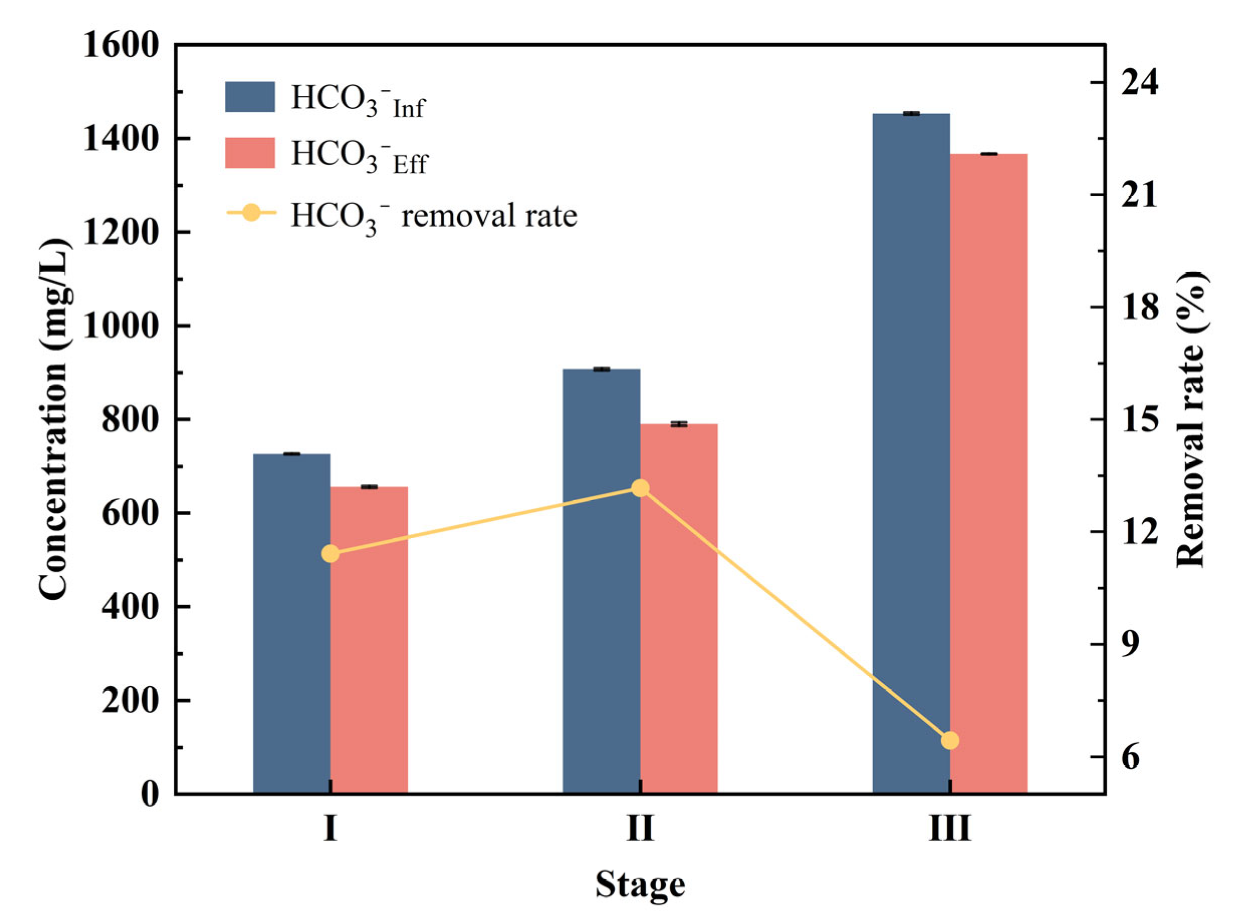 The carbonate system in water primarily exists in four forms: CO2, H2CO3, HCO3 and CO32−. At pH 6~10, HCO3 mainly dominates the solution [48]. Since the influent was artificially prepared with ammonia nitrogen, sodium bicarbonate, small amounts of nutrients, and trace elements, inorganic carbon (IC) in the system was mainly present as HCO3. Changes in HCO3 concentration are shown in Figure 10. Effluent HCO3 concentrations were consistently lower than influent values, indicating that an HCO3 consuming reaction occurred in the system. Additionally, with increasing influent HCO3 concentration, the removal rate initially increased and then decreased. When HCO3 exceeded 1000 mg/L, its removal rate declined.