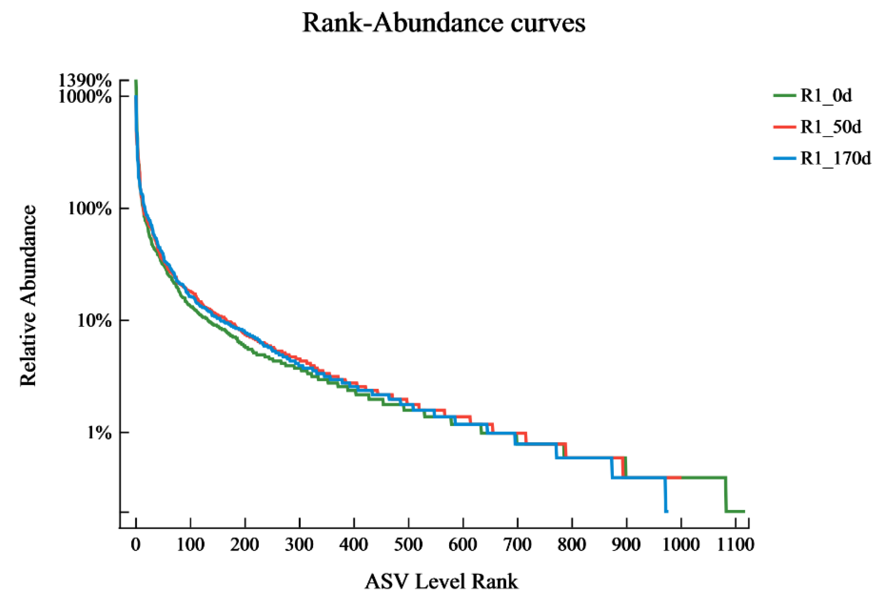 As shown in Figure 12, the curves for the three phases displayed similar shapes. In the initial phase, the microbial community was dominated by a few species, followed by a sharp decline in abundance, creating a typical low-evenness pattern. The R1_170d curve was relatively flatter, indicating that after 170 days of operation, although a few species still dominated, the abundance of other taxa increased. This suggests a shift toward greater stability, while the community remained in a phase of selective enrichment.