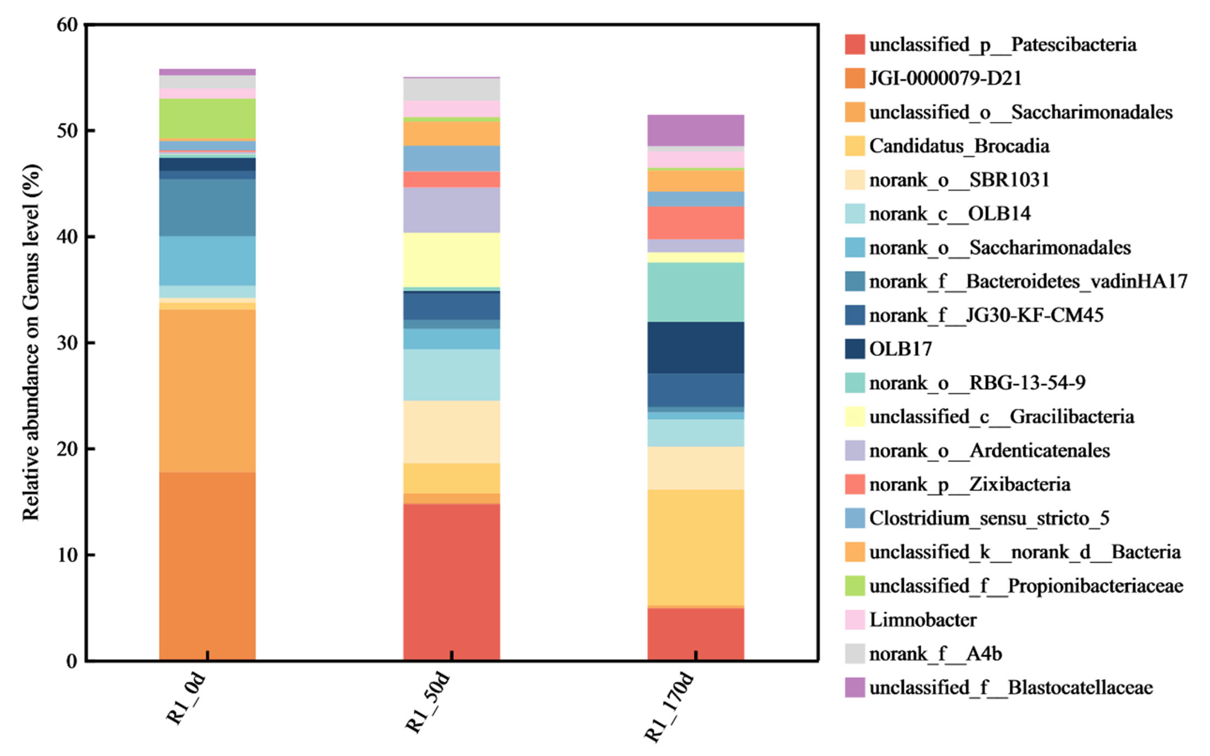 Across all samples, the dominant phyla were mainly Chloroflexi, Patescibacteria, Proteobacteria, Bacteroidota, and Synergistota (Figure 13). At the initial stage (R1_0d), the community was dominated by Patescibacteria (21.21%), Synergistota (20.61%), and Proteobacteria (11.69%), followed by Chloroflexi (10.90%), Bacteroidota (10.60%), and Desulfobacterota (6.42%). The presence of Synergistota and Desulfobacterota indicated that the inoculum sludge contained anaerobic fermentative bacteria and sulfate-reducing bacteria (SRB). However, the lack of significant sulfate reduction in the early stage suggested inhibition of SRB activity. This early inhibition is likely mainly due to the inorganic nature of the influent (minimal readily degradable organic carbon), which restricts the availability of electron donors needed for sulfate reduction. Additionally, the reactor operated under constant microaerobic conditions (DO ≈ 0.1~0.2 mg/L) and experienced a continuous pH decrease; both factors are known to inhibit obligate anaerobic SRB and would have reduced their metabolic activity from the beginning. The relatively high abundance of Proteobacteria (11.69%) may reflect the metabolic flexibility of facultative anaerobes, which could oxidize some ammonia via short-term nitrification under microaerobic conditions [50]. The continuous decline in pH likely further suppressed strictly anaerobic SRB, limiting sulfate reduction [51]. Chloroflexi (10.90%) might contribute to carbon fixation or acid production under oligotrophic conditions, although their specific roles need further investigation across stages.