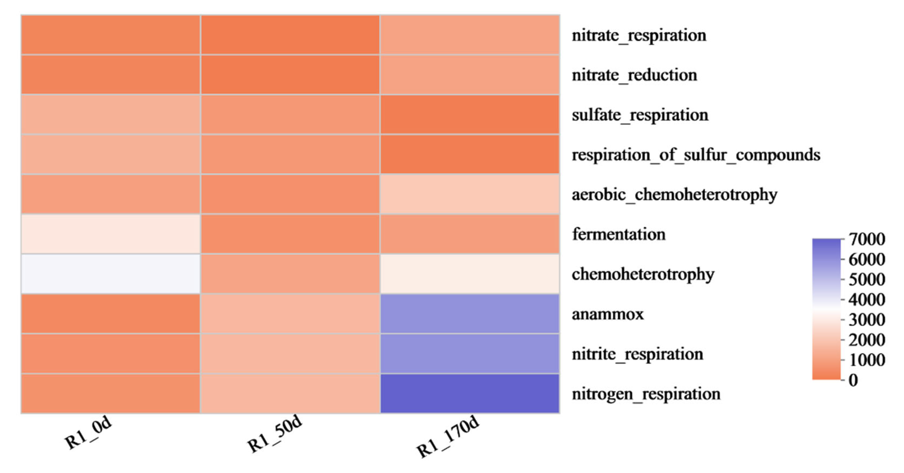 The consistently high abundance of Proteobacteria (15.76%) may indicate increased activity of ammonia-oxidizing bacteria (AOB) or nitrite-oxidizing bacteria (NOB) within this group. Trace oxygen levels (DO ≈ 0.1~0.2 mg/L) and catalase activity suggest that facultative anaerobes could produce oxygen through reactive oxygen species (ROS) detoxification, supporting short-term ammonia nitrification. The nitrite produced may then be used by anammox bacteria or chemically denitrified to N2, aligning with the observed gas composition (98.89% N2). The enrichment of Planctomycetota (11.27%) indicates that anammox bacteria remained active at R1_170d, but their metabolism was likely limited by changes in electron acceptors, leading to decreased NH4+-N removal efficiency compared to R1_50d.