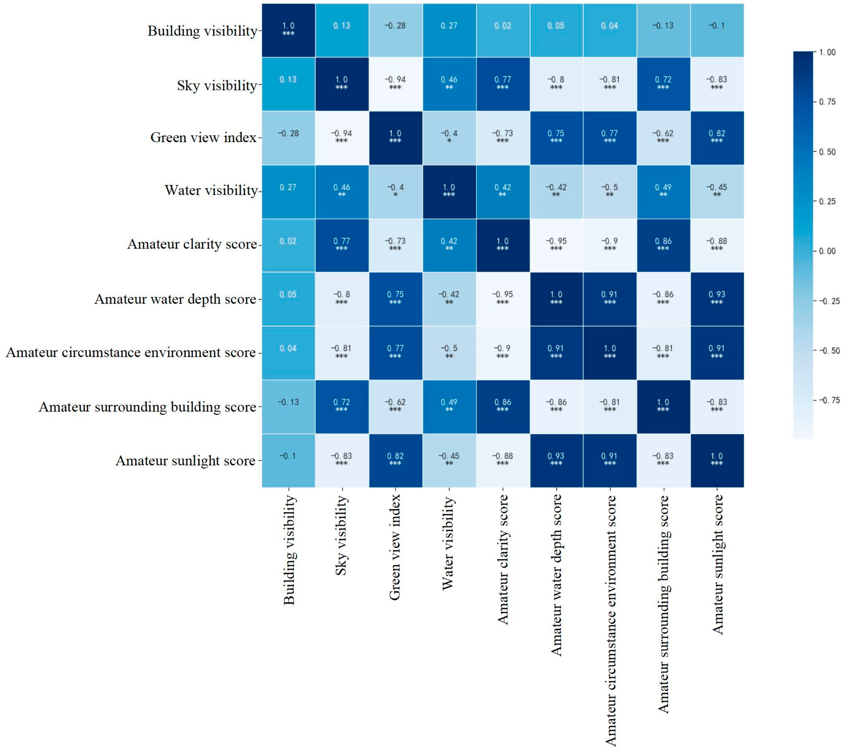 | Sky visibility | −0.49 *** | 0.51 *** | 0.45 *** | 0.47 *** | −0.54 *** |