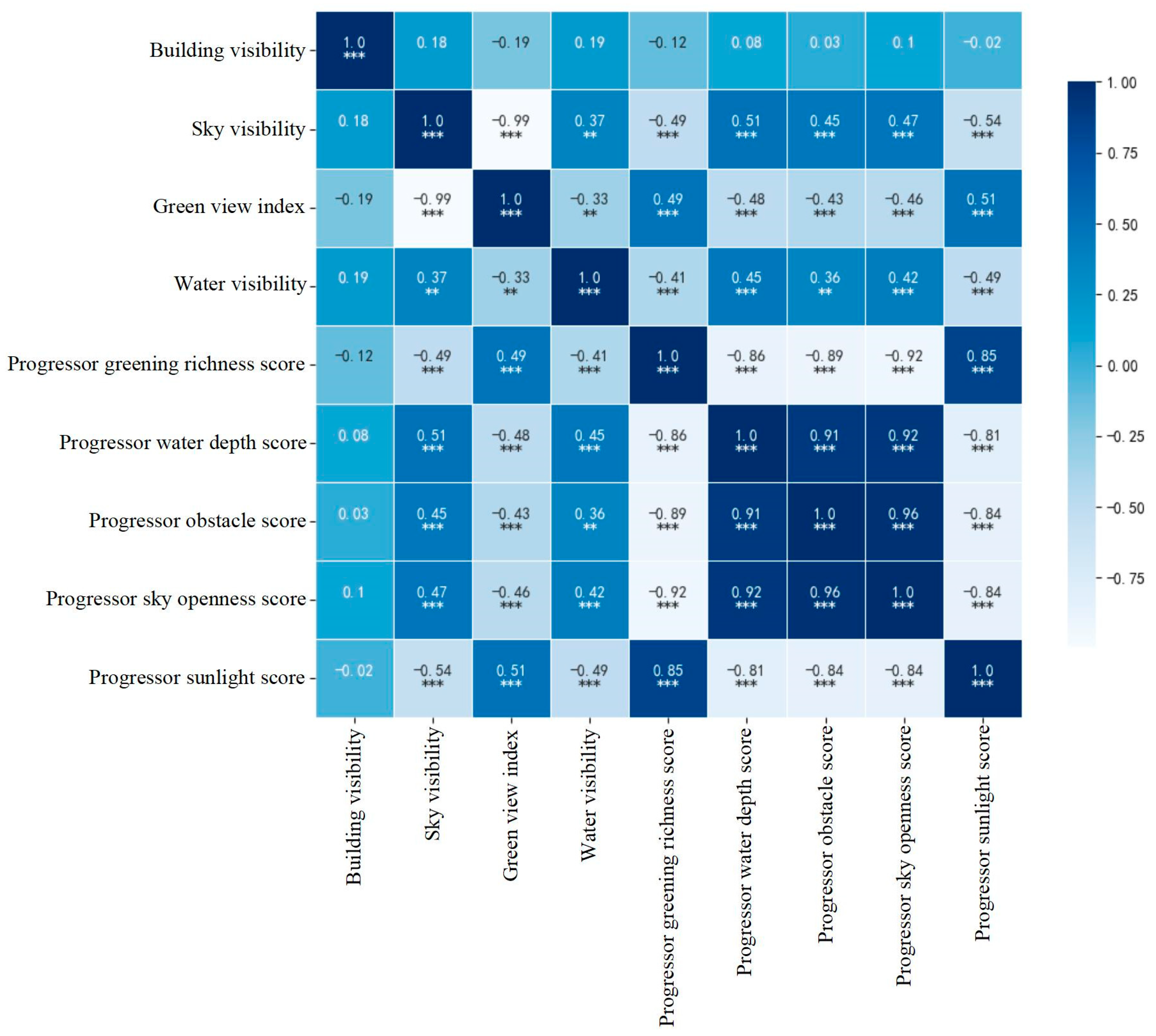 | Sky visibility | 0.77 *** | −0.8 *** | −0.81 *** | 0.72 *** | −0.83 *** |