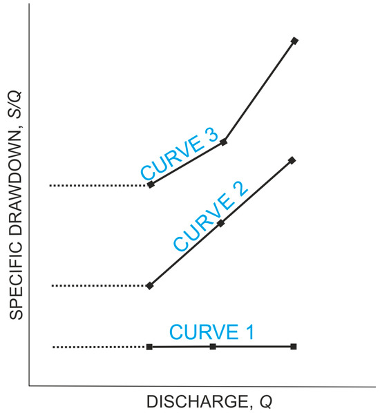 For correctly constructed and equipped wells, the function S/Q = f(Q) can take one of three shapes. Their types are illustrated in Figure 1. If the exponent P in Equation (3) takes a value equal to 1, then the flow follows the Dupuit assumption (Curve 1). When the exponent of power is equal to 2, the flow is linear in the aquifer and mixed in the gravel-pack zone (Curve 2). The final case is the most common, which involves the development of turbulence into an aquifer near-borehole zone (Curve 3).