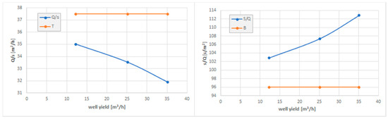 Repetition of pumping tests indicated that all wells had significant hydraulic resistance coefficients. Therefore, the efficiency curves have been re-determined using Equation (5). Hydrogeological parameters were then calculated and analyzed. Considering the final and initial parameters of each site, the results were compared, and an interpretation was made of the changes that occurred during the period of operation.
