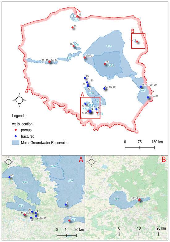 The study material contained wells that featured both fissure and porous aquifers. All wells were numbered from 1 to 40. In the following sections of this paper, these symbols are used uniformly on schematic maps, in figures and in tables.