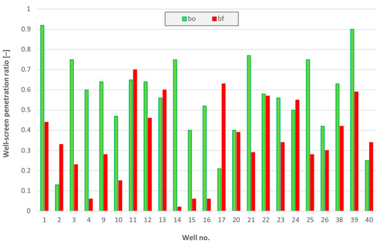 Wells no. 14, 15, and 16 are very interesting cases. Despite initially positive hydraulic parameters, the hydraulic conductivity of the aquifer was improved and the boreholes became clogged. This is manifested by a very low final penetration ratio. In each case, the direct cause was an overestimation of the well-yield and operation at too high a hydraulic gradient, i.e., low efficiency. These three above-mentioned wells had a critical well-yield of 17% of the primary pumping rate. The other wells in Figure 10, which experienced a reduction in their critical well-yield, have a well-yield of 60% of the initial pumping rate.