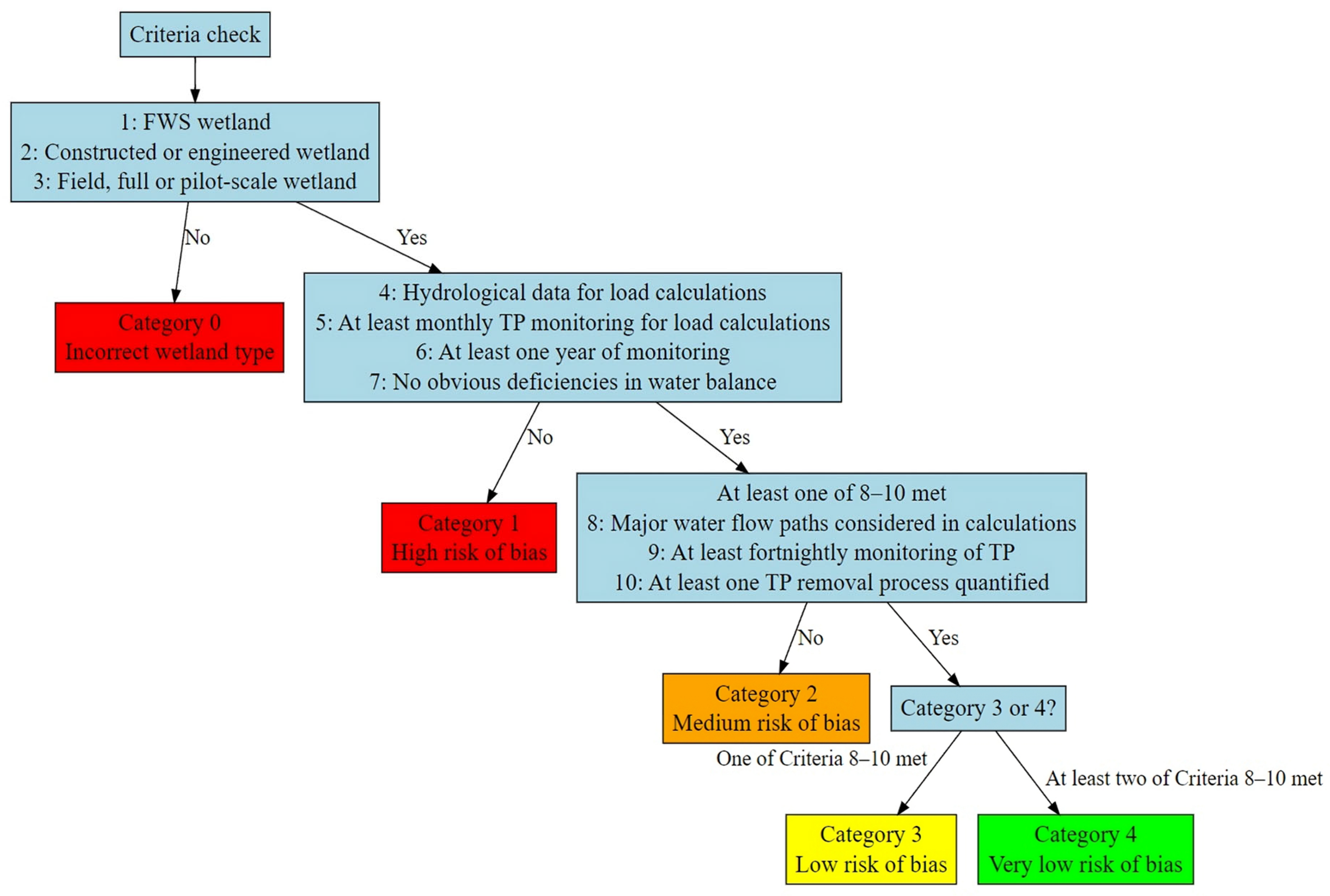 This approach was used to limit bias and ensure high confidence in the findings and conclusions of each study with regard to meeting the objectives of this review. To avoid duplication, shared datasets used by multiple studies were removed, with the most complete sources retained. Data were extracted for phosphorus retention metrics (efficiency and rates), wetland characteristics (e.g., wetland area and depth), and contextual factors (e.g., vegetation and bed sediment characteristics) where available (Table S2). Because the screening criteria emphasised monitoring quality and reporting completeness, the dataset is biassed towards regions with greater research capacity. However, this trade-off was accepted to reduce information and selection bias and enable an objective review to be conducted. Study inclusion was limited to English language publications, which may reduce geographic representation and is considered in the interpretation of the results.