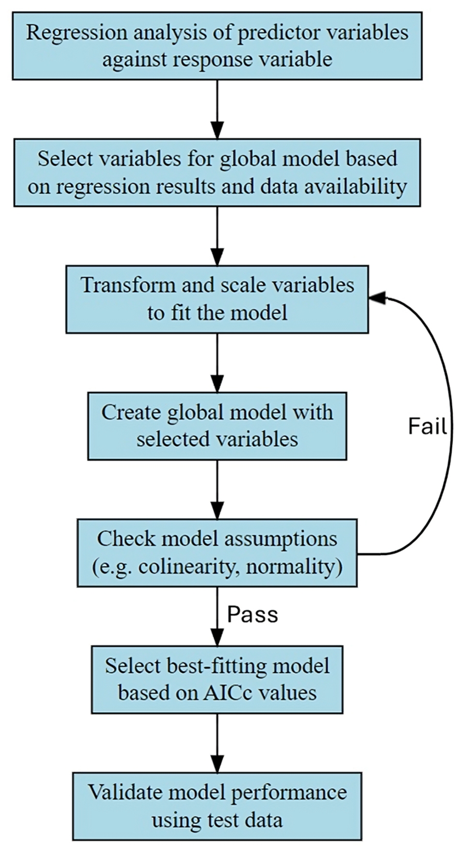• Candidate model selection based on second-order Akaike’s Information Criterion (AICc) values using the MuMIn R package (version 1.48.4). The model with the lowest AICc was considered to have performed best, balancing model complexity, and fit to the used dataset.