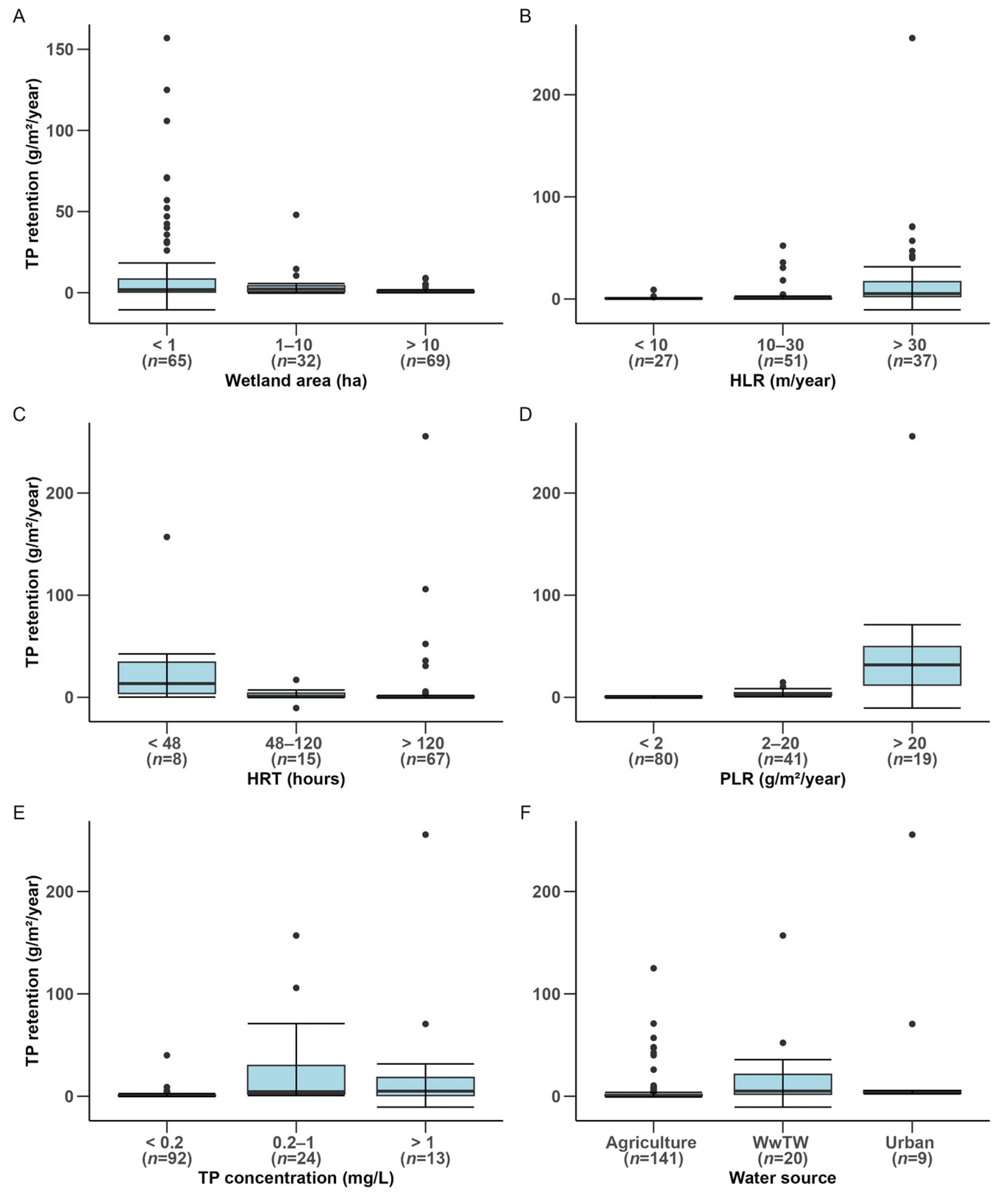 Figure 5. Phosphorus mass retention across wetlands of varying (A) area, (B) hydraulic loading rates, (C), hydraulic retention times, (D) phosphorus loading rates, (E) total phosphorus inflow concentrations, and (F) water sources. Boxplots illustrate median retention efficiencies and interquartile range. Whiskers extend to 1.5 times the interquartile range and dots represent outliers beyond this range. The number of observations within each group is shown by n.