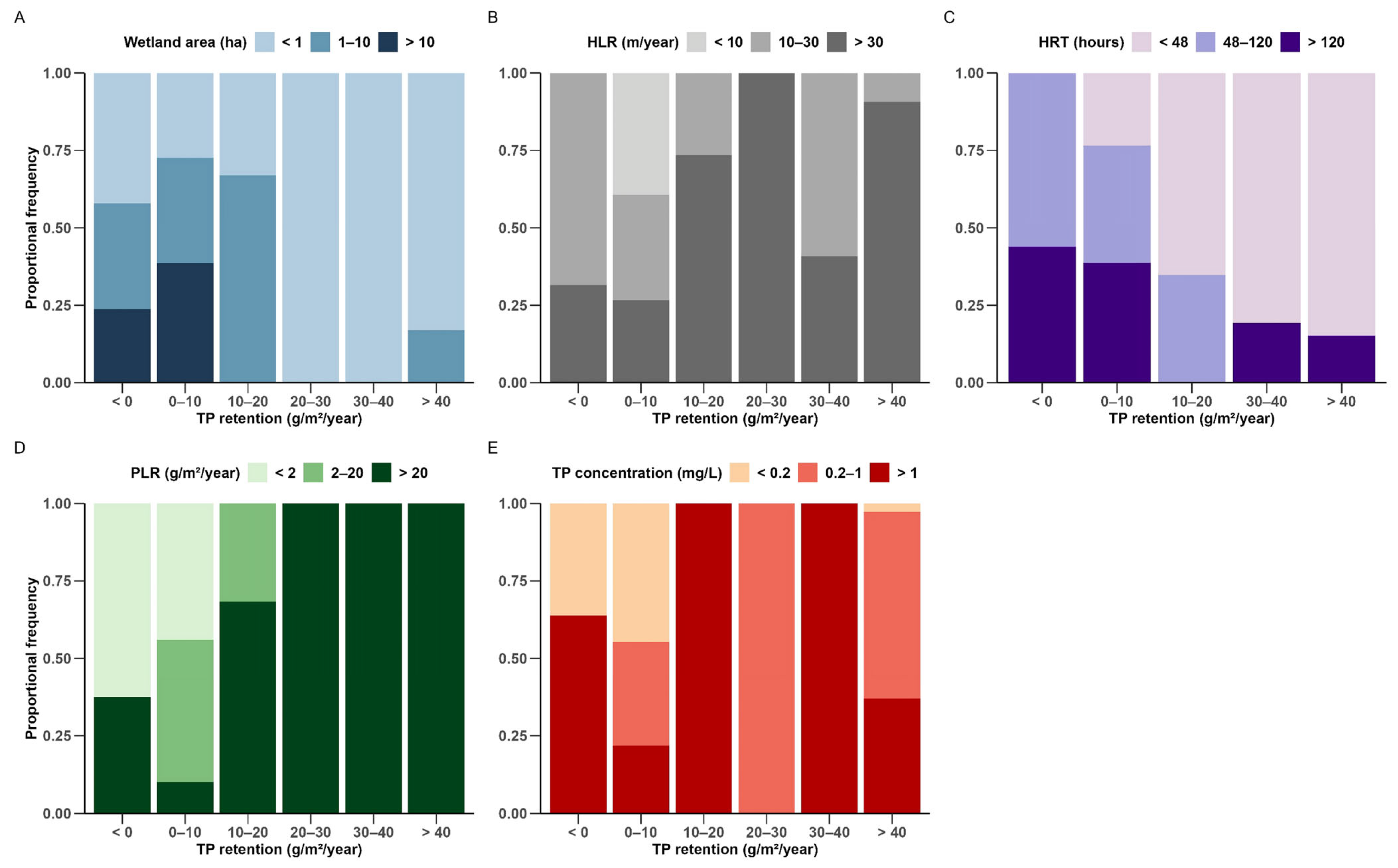 Figure 4. Proportional distribution of total phosphorus retention efficiency across wetlands, influenced by (A) wetland area, (B) hydraulic loading rate, (C) hydraulic retention time, (D) phosphorus loading rate, and (E) phosphorus inflow concentration. The stacked bar plots represent the proportional frequency of wetlands achieving total phosphorus retention in various ranges.