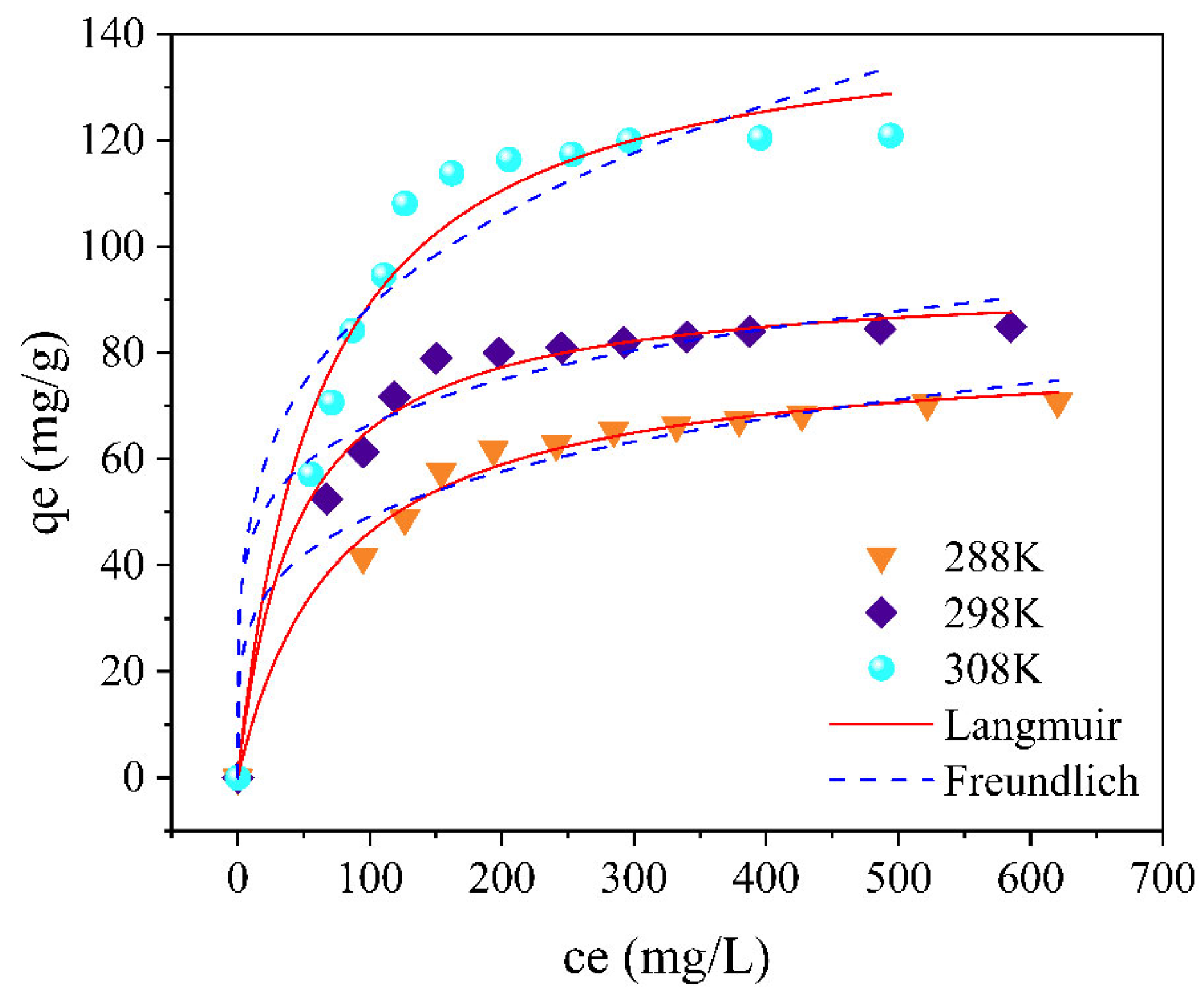 - The quasisecond-order kinetic fitting model can partially describe the adsorption kinetic process of FeCo on PE-MPs. The adsorption behavior of PS-MPs on the adsorbent conforms to the Freundlich isotherm model. The adsorption of FeCo on PE-MPS is a chemical adsorption process, with a maximum adsorption capacity of 120.92 mg/g for FeCo on PE-MPs at 45 °C. The influence of the pH on the adsorption of FeCo is relatively small.