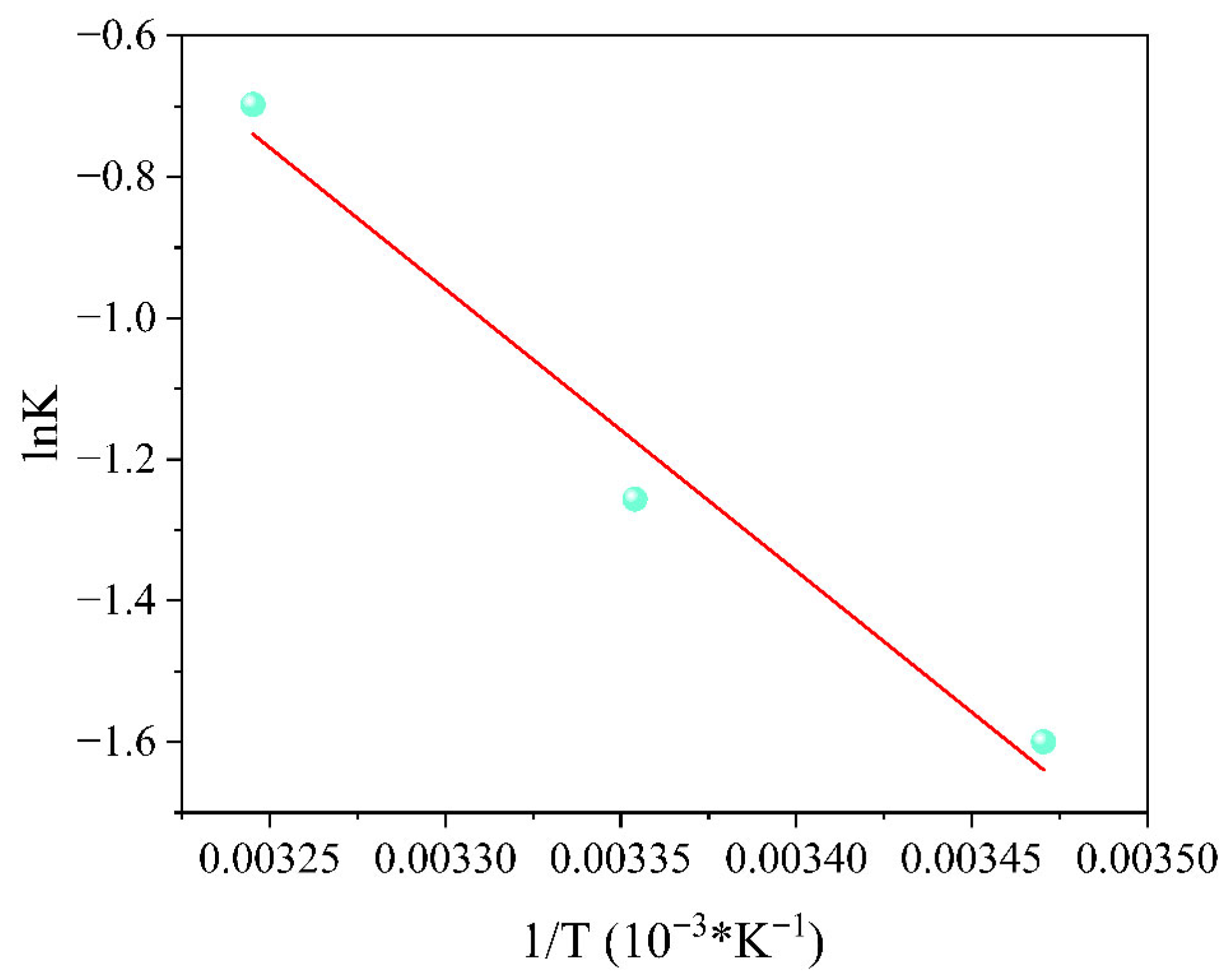 | T (K) | lnK | ΔG (KJ/mol) | ΔH (KJ/mol) | ΔS (J·mol−1·K−1) |