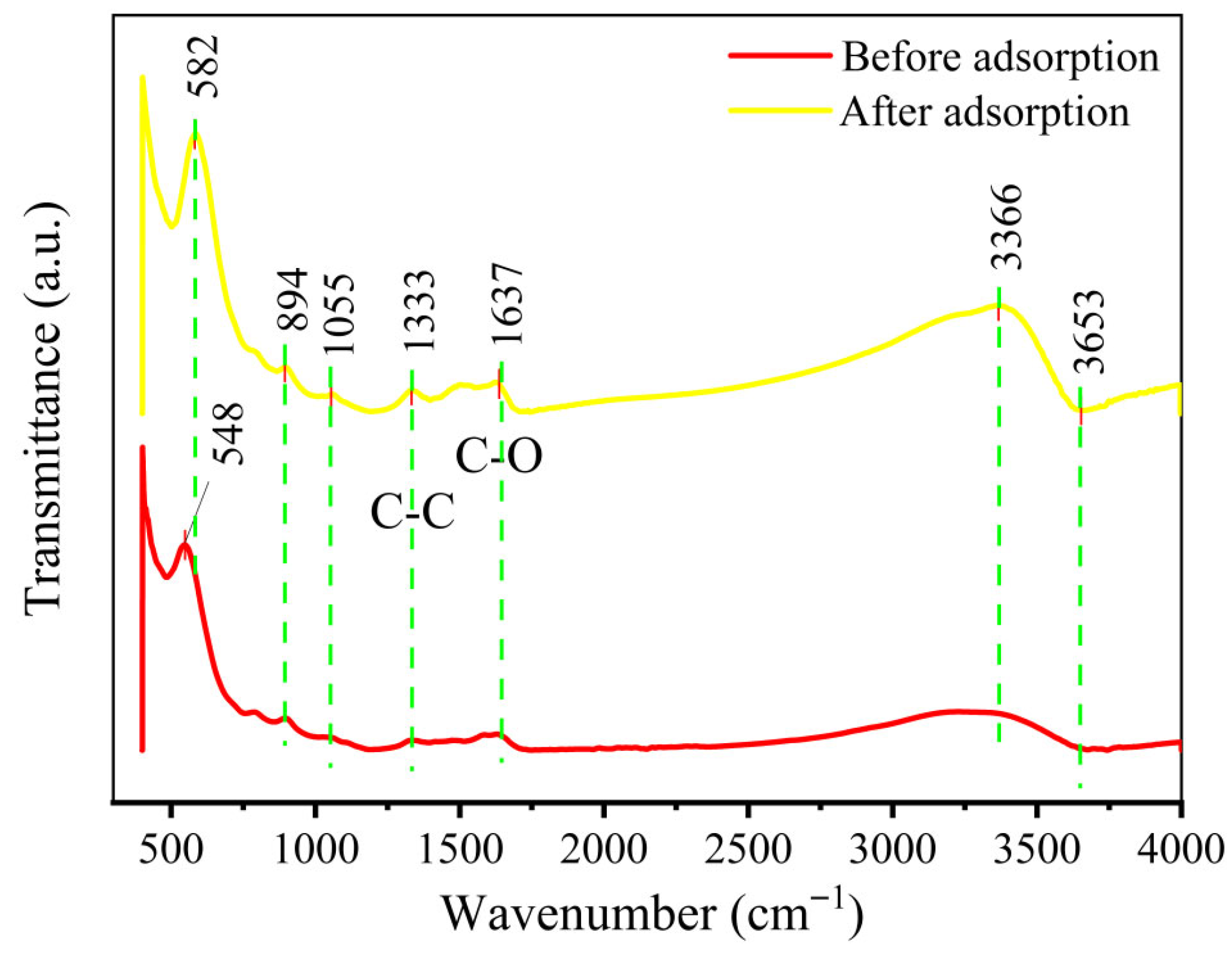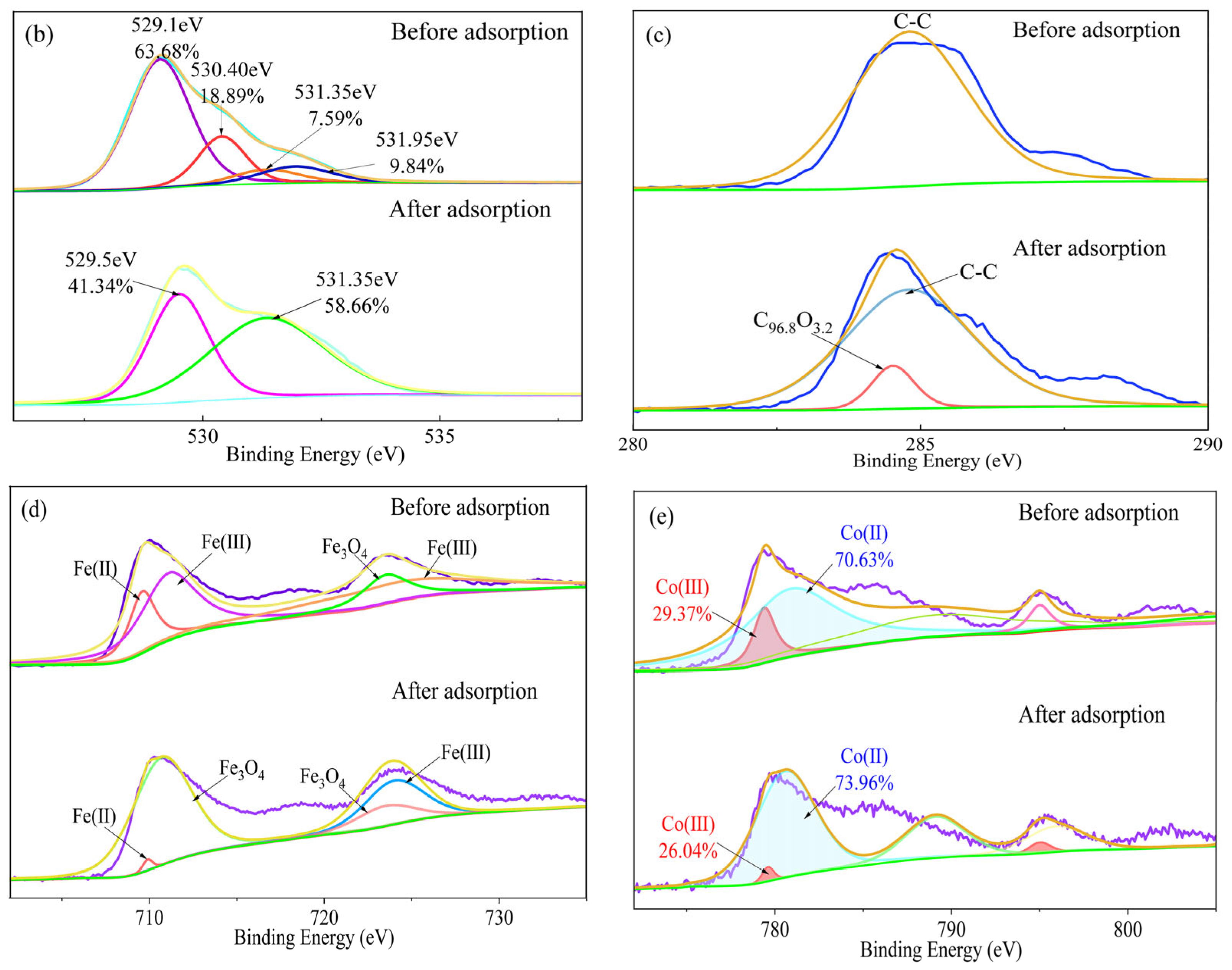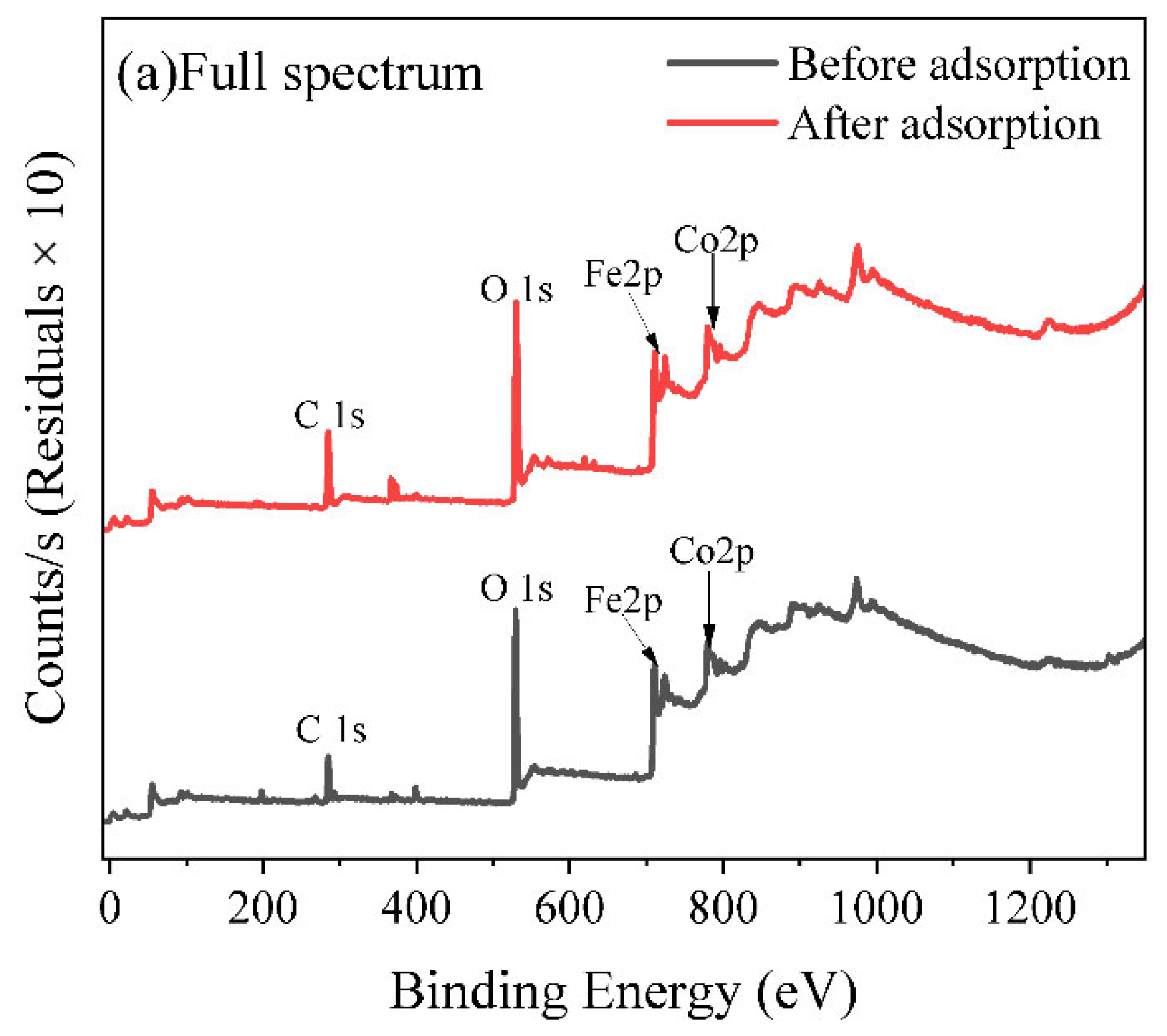 - The adsorption process of FeCo on PE-MPs involves the formation of hydrogen bonds, the coordination complexation of metal with hydroxyl groups, and hydrophobic interactions. The site substitution of cobalt for iron changes the structure and electronic properties of the material, enhancing the adsorption effect of the material on PE-MPs, and the formation of a solid alloy solution stabilizes the material structure. In summary, the process of preparing FeCo materials is simple and cost-effective and is capable of achieving efficient PE-MP adsorption; thus, the toxicity of PE-MPs in water can be effectively controlled, and these materials have good application prospects in water treatment and pollution remediation scenarios.
