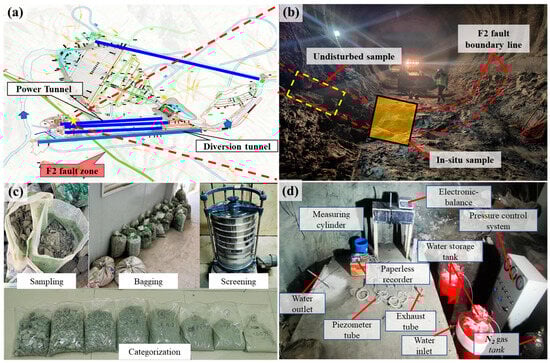 F2 fault zone of the water-diversion power station tunnel: (a) study site; (b) tunnel excavation; (c) in situ sample; (d) field testing.