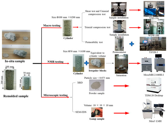 To systematically investigate differences in physical, mechanical, and structural properties between remolded and in situ samples, comprehensive tests combining macroscopic mechanical characterization with microstructural analysis were conducted on both sample types (Table 2). First, mechanical property tests were performed on remolded samples, including direct shear, uniaxial compression, triaxial compression, and permeability tests. Direct shear and uniaxial compression tests were conducted using a direct shear apparatus (YSD-10a, Mete Test Instrument Co., Ltd., Tianjin, China), while triaxial compression tests were performed using a universal testing machine (WDW-100, Beijing Zhongjian Road Industry Instrument Equipment Co., Ltd., Beijing, China). Permeability tests were conducted using both a modified permeameter and a coupled seepage–stress testing system (YSYH-3, Jiangsu Yongchang Educational Instrument Manufacturing Co., Ltd., Changzhou, China). Second, to characterize differences in pore structure, nuclear magnetic resonance (NMR, MesoMR12-040H-I, Suzhou Nuomai Analytical Instruments Co., Ltd., Suzhou, China) analysis was performed on remolded and in situ samples. Key parameters, including pore size distribution, connectivity, and porosity, were determined to enable quantitative analysis of pore-scale structural controls on physical properties. Finally, microscopic analyses of in situ samples included (1) X-ray diffraction (XRD, TDM-20, Dandong Tongda Technology Co., Ltd., Dandong, China) to identify mineral composition and relative abundances and (2) scanning electron microscopy with energy-dispersive spectroscopy (SEM-EDS, Mira3 LMH, Guangzhou Gaocai Instrument Co., Ltd., Guangzhou, China) to characterize microstructural morphology and mineral spatial distribution. This integrated multi-scale experimental approach systematically reveals fundamental differences between in situ and remolded samples. These data provide a robust foundation for understanding fault zone mechanical behavior and developing constitutive models.