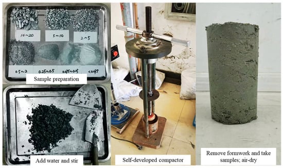 - Water addition, mixing, and manual pre-compaction: The inner mold walls were lined with 0.2 mm PVC film to reduce boundary friction. Material was filled in layers to controlled heights, lightly compacted manually with roughened interfaces to enhance interlocking, ensuring uniform distribution in each 45 mm layer.