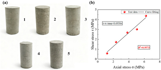 Results of the direct shear test: (a) test samples (No. 1–5) and (b) σ-τ relationship curve.