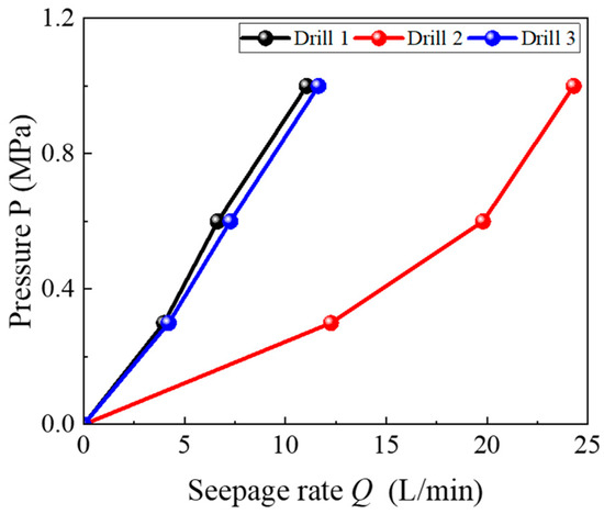 Test results (Figure 5, Table 4) show that F2 fault zone permeability ranges from 3.58 to 7.67 Lu, with permeability coefficients of 3.50 × 10−5 to 7.51 × 10−5 cm/s, classifying it as weakly permeable. With only three sets of pressure-rise data available, water-injection tests could only generate pressure-rise curves, not complete pressure-fall curves. Consequently, accurately determining P-Q curve type is challenging. Specifically, pressure-rise curves for Boreholes 1 and 3 exhibit near-linear behavior consistent with Type A (laminar flow), whereas Borehole 2 exhibits a concave-up profile (convex toward the flow rate axis), indicating Type B (turbulent flow) or Type E (filling-type) characteristics. The temporal stability of curve profiles across all three test sections (no looping or displacement observed) indicates that rock fracture structure remained stable during pressure water testing.