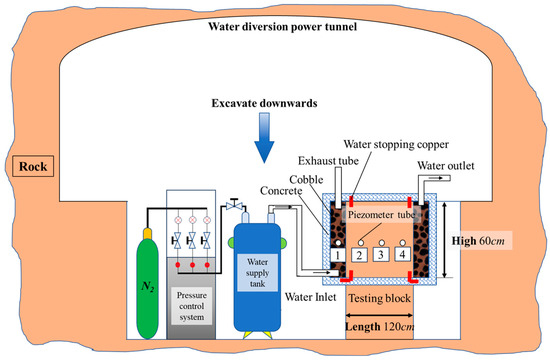 Figure 6 illustrates the layout for the in situ permeation test. A test block incorporating the entire F2 fault was prepared with dimensions of 120 cm (length) × 70 cm (width) × 60 cm (height). The F2 fault exhibits a width of approximately 20 cm, a dip angle of 75–80°, and an exposed elevation of approximately 2070 m. This fault is located 105 m below the reservoir’s normal storage level of 2175 m. Consequently, sample width was determined based on the fault breccia zone width and fault plane dip angle to ensure that samples accurately reflected in situ geological conditions. Experimental apparatus (nitrogen cylinders, pressure control systems, and water storage tanks) were then installed and calibrated to verify operational readiness. After calibration, the nitrogen cylinder valve was opened. Water pressure was regulated through the pressure control system to saturate the sample. Once continuous, stable flow emerged from the outlet, indicating full saturation, the in situ permeability test commenced. Pressure-measuring tubes were installed at 30 cm intervals to monitor localized pore water pressure in real-time. This experiment simulated fault permeability characteristics in real geological environments, providing data for engineering design and safety assessments.