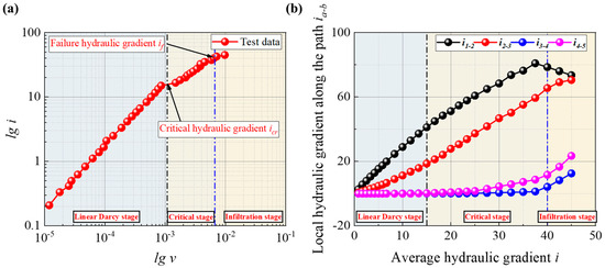 In situ permeation test: (a) lg v-lg i relationship curves and (b) variation in local hydraulic gradient ia-b along the path.