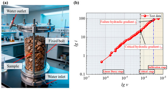 Figure 7 presents the results of the in situ permeation test. Figure 7a presents the relationship between lg v and lg i during in situ permeation deformation failure. Seepage response was divided into three stages. The initial stage exhibited linear Darcy flow with a permeability coefficient of 5.74 × 10−5 cm/s. As hydraulic gradient increased to a critical state, permeability coefficient surged to 8.94 × 10−5 cm/s (approximately 55.7% increase), corresponding to a critical hydraulic gradient (icr) of 15.0. This change indicated particle migration or microstructural reorganization, leading to enlarged flow pathways. As hydraulic gradient increased further, permeability coefficient rose to 1.55 × 10−4 cm/s, exceeding 170% of the initial value. A flow surge occurred, indicating permeation failure. The corresponding failure hydraulic gradient (if) was 40.0.