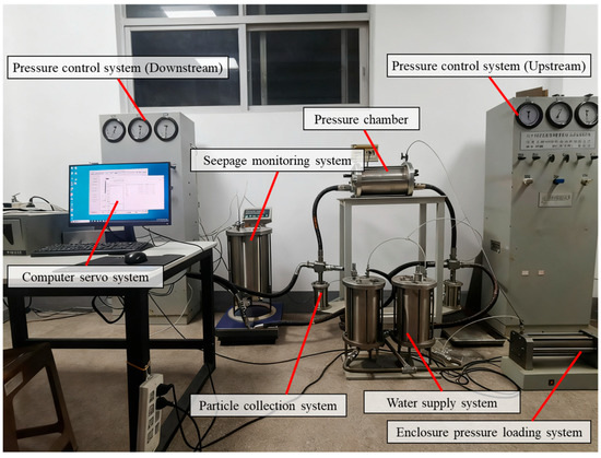 Figure 9 shows the seepage–stress coupling system developed for this study. The apparatus consists of a water supply system, pressure control system, seepage chamber, confining pressure loading system, seepage monitoring system, particle collection system, and computer servo system. The pressure control system includes two independent control units for simultaneous regulation of upstream and downstream pressures. The pressure chamber is positioned horizontally to allow real-time changes in seepage direction. Test samples (ø100 mm × h200 mm) are installed and secured by vertically orienting the pressure chamber.