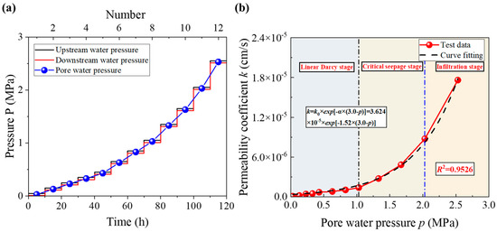 Results of seepage–stress coupling tests: (a) loading process and (b) relationship curves between permeability coefficient k and pore water pressure p.