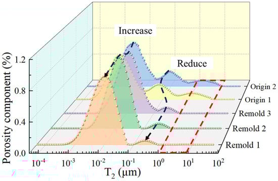 Figure 14 shows the pore size distribution of the in situ and remolded samples. Both sample types have similar average porosity, yet their pore structures differ significantly. In situ samples predominantly contain medium and large pores, with strong medium-pore signals and a high proportion of large pores, demonstrating pronounced structural heterogeneity and favorable pore connectivity. In contrast, remolded samples are characterized by small and medium pores, with more uniform pore size distribution and smaller average pore diameters. Pores are primarily interconnected through minute throats.