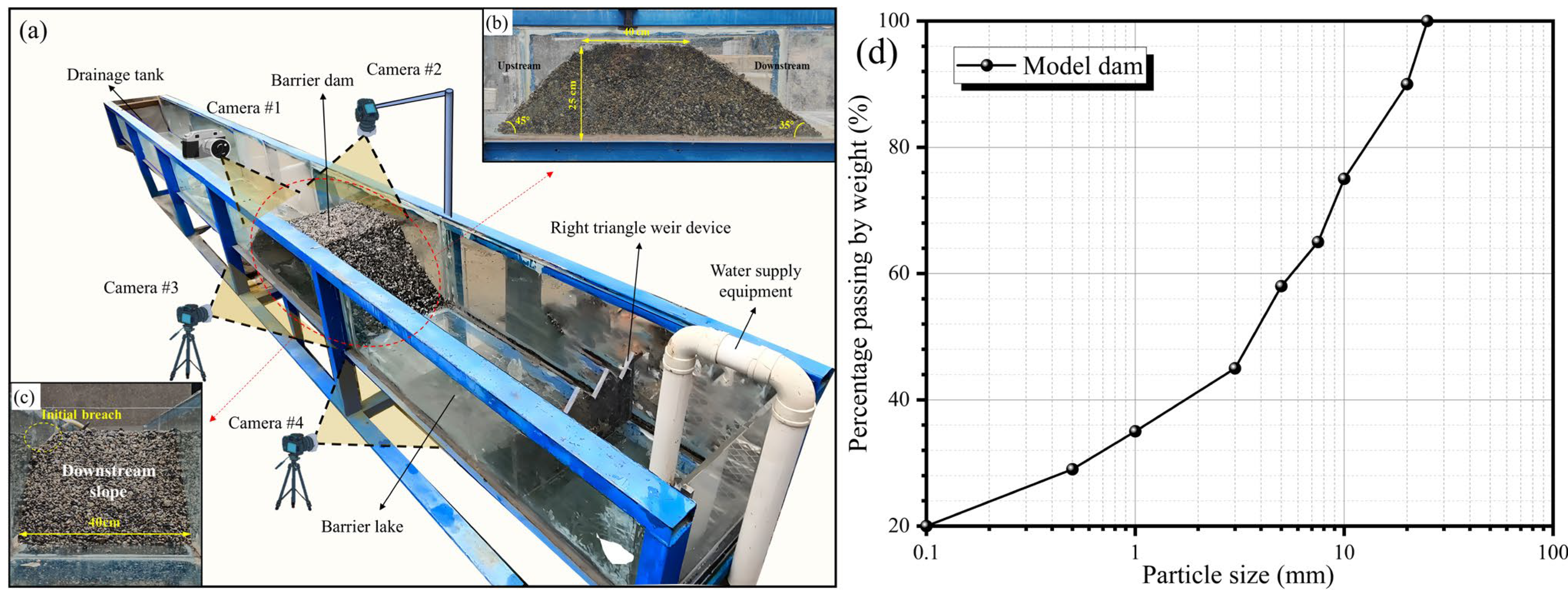 - Takayama, S.; Imaizumi, F. Effects of Coarse Particles on Downstream Face Erosion Processes and Outflow Discharge during the Overtopping of a Landslide Dam. Landslides 2023, 20, 351–366. [Google Scholar] [CrossRef]
