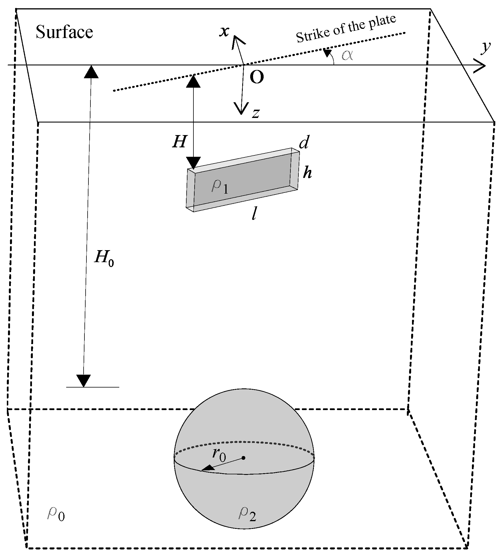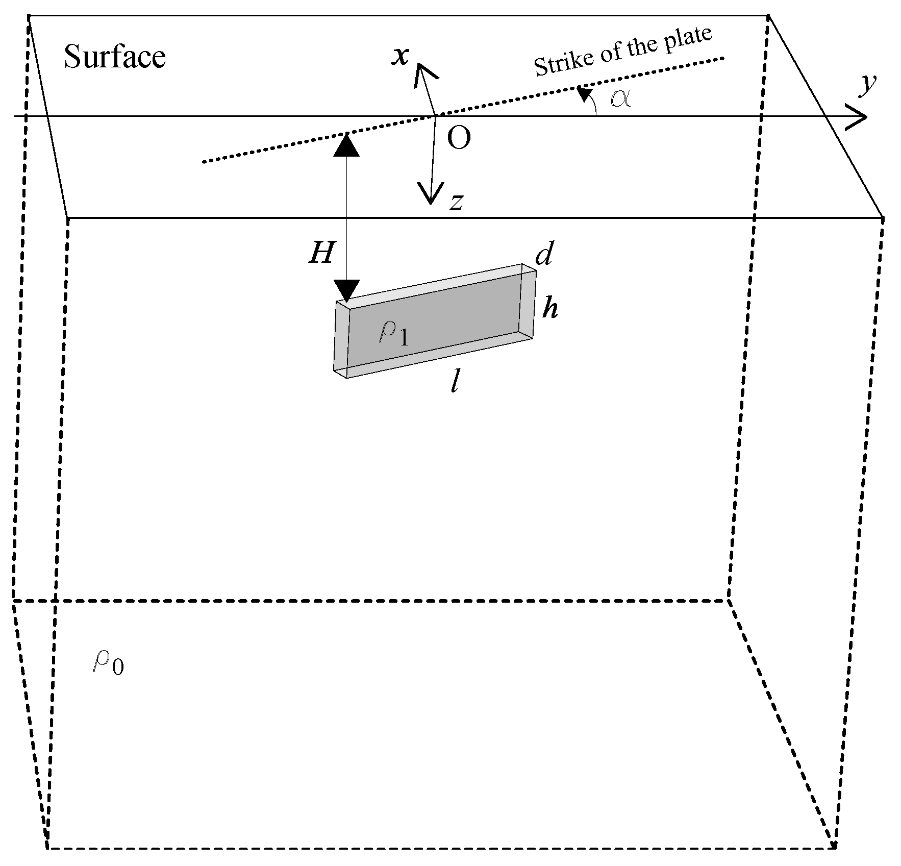 A plate-shaped anomalous body with resistivity ρ 1 = 0.1 Ω·m is embedded in a half-space background medium of resistivity ρ 0 = 1000 Ω·m, buried at a depth of 6 m (top depth), as illustrated in Figure 1. The dimensions of the anomalous body are 5 m × 2 m × 4 m. The angle α between the strike direction of the plate and the survey line is 30°.